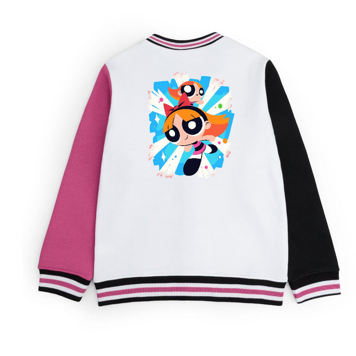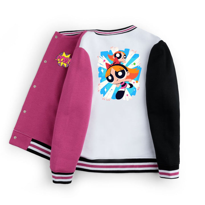 FLEECE BASEBALL JACKET - SHOCKING PINK WHITE POW POWER PUFF GIRLS